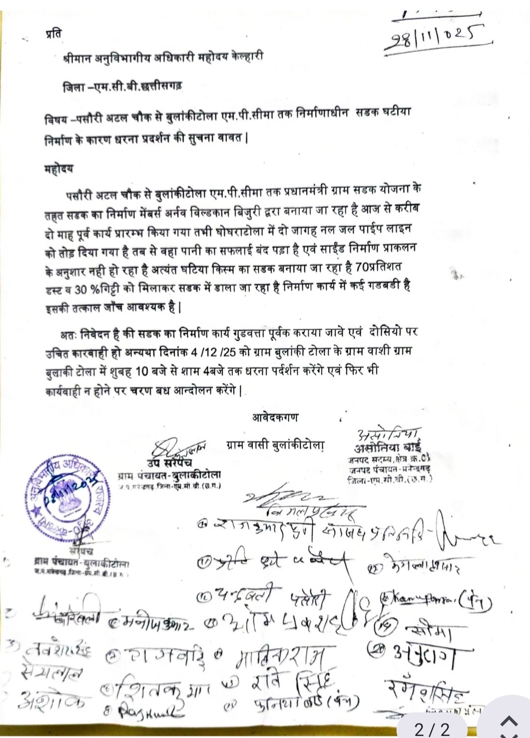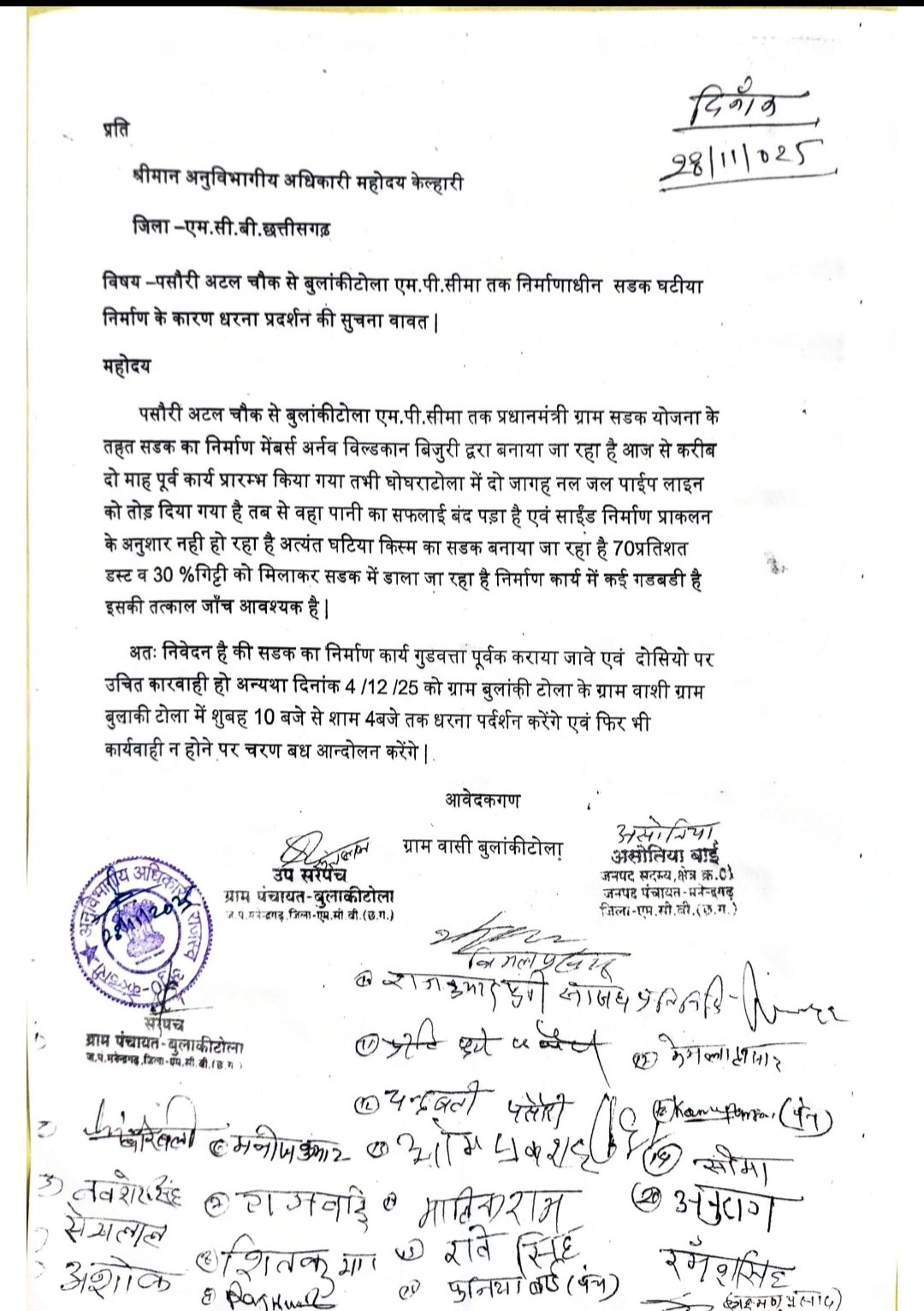 बुलाकीटोला में धरना प्रदर्शन की घोषणा करते हुए शासन से अपील किया गया है और गुणवत्ता विहीन कार्यों पर गुणवत्ता पूर्वक कार्य करने और जिम्मेदार लोगों पर कार्रवाई करने की बात कही है