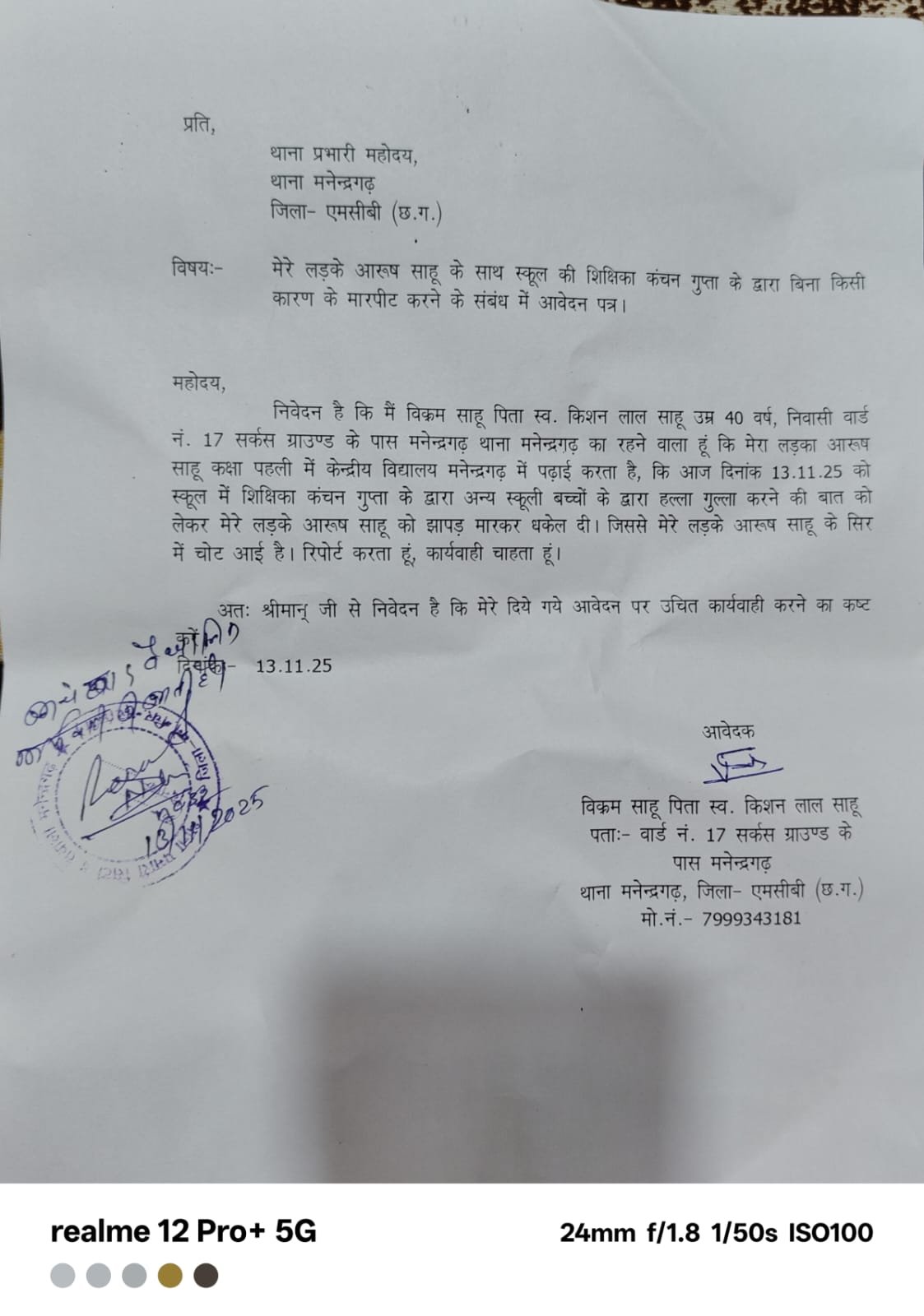 पीड़ित छात्र के पिता विक्रम साहू, निवासी वार्ड नं. 17 सर्कस ग्राउंड, ने थाना मनेंद्रगढ़ में आवेदन देकर शिक्षिका के खिलाफ कार्रवाई की मांग की है। आवेदन में उल्लेख किया गया है कि घटना 13 नवंबर 2025 की है, जब कक्षा में अन्य बच्चों के हल्ला-गुल्ला करने पर शिक्षिका ने गुस्से में आकर निर्दोष  छात्र को थप्पड़ मार दिया और धक्का दे दिया, जिससे उसके सिर में चोट आई।