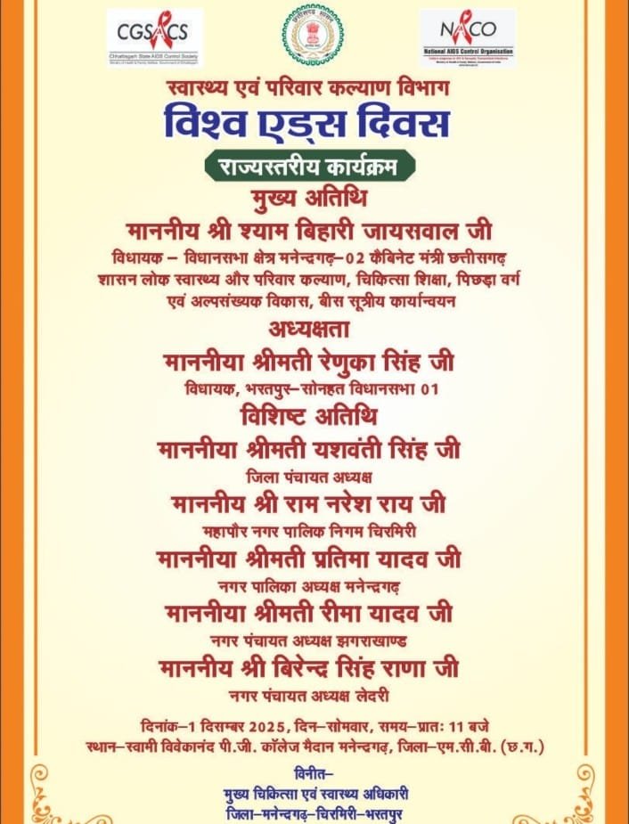 विश्व एड्स दिवस पर राज्यस्तरीय कार्यक्रम मनेंद्रगढ़ 1 दिसंबर को मनेंद्रगढ़ स्वामी विवेकानंद महा विद्यालय में आयोजित होने जा रहा है , मुख्य अतिथि होंगे स्वास्थ्य मंत्री श्याम बिहारी जायसवाल