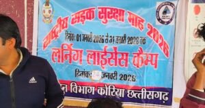 सड़क सुरक्षा माह के अंतर्गत इन दिनों एमसीबी जिले के खड़गवां जनपद पंचायत क्षेत्र में कैम्प लगाया जा रहा है  कोरिया आरटीओ के द्वारा सड़क सुरक्षा कार्यक्रम में क्षेत्र के लोगों ने बढ़ चढ़कर हिस्सा लिया जिसमें आरटीओ के पास लर्निंग लाइसेंस के लिए सैकड़ों फ्रॉम जमा किया गया ।