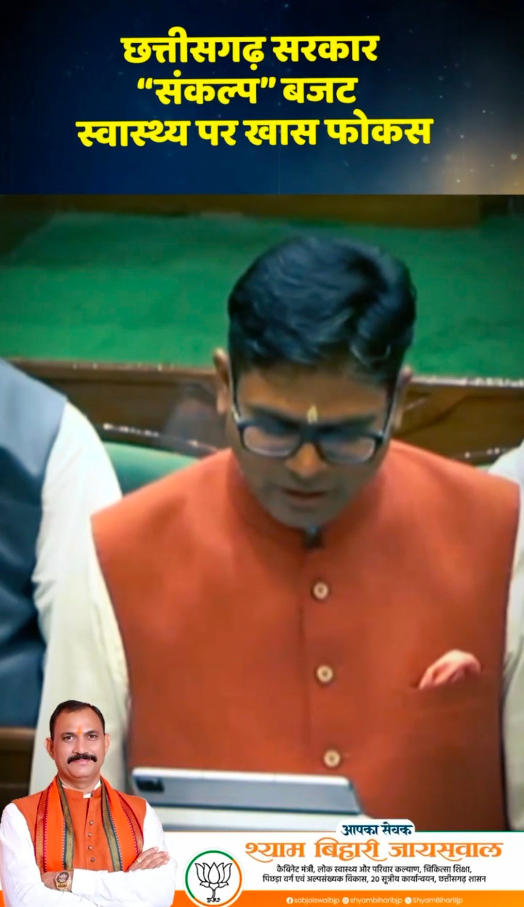 छत्तीसगढ़ के बजट 2026-27 में स्वास्थ्य क्षेत्र को मिली ऐतिहासिक प्राथमिकता पर प्रदेश के स्वास्थ्य मंत्री श्री श्याम बिहारी जायसवाल ने मुख्यमंत्री श्री विष्णुदेव साय एवं वित्त मंत्री श्री ओ. पी. चौधरी के प्रति आभार व्यक्त किया है।