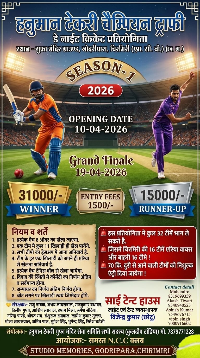 भव्य क्रिकेट प्रतियोगिता 2026** 🏏 **स्थान:** हनुमान टेकरी, गोदरी पारा गुफा मंदिर ग्राउंड खेल जगत के सभी प्रेमियों और खिलाड़ियों का हार्दिक स्वागत है! **चैंपियन ट्रॉफी** के तत्वावधान में एक विशाल क्रिकेट टूर्नामेंट का आयोजन किया जा रहा है। ### 📅 **प्रमुख जानकारी:** * **प्रारंभ तिथि:** 10 अप्रैल 2026